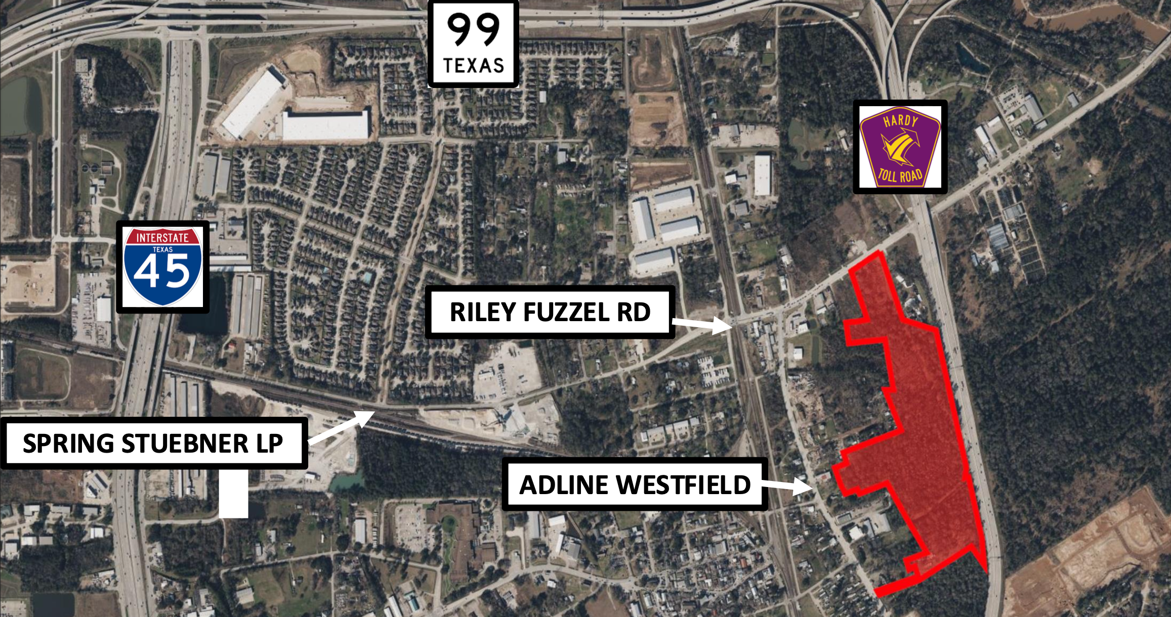 This +/- 40 AC tract is highly desirable for both developers and/or users as a prime location for office warehouse development. This property has over 2,500 feet of frontage along the Hardy Toll Rd, an access point on Riley Fuzzel on the northern border, and a 60’ access easement to Aldine Westfield on the southwestern border of the property. There is also +/- 9 AC available on the northwestern border of this property that would bring the total site to +/- 49 AC with multiple access points on Aldine Westfield and one on Riley Fuzzel. The property is desirably located just southwest of the intersection of the Hardy Toll Rd and the Grand Parkway less than 6 miles from The Woodlands giving this property fantastic access to the Houston highway system as well as proximity to higher end homes and development. We have turn key investment opportunities as well as build to suit options available. Please contact broker for more information on potential development options and pricing.